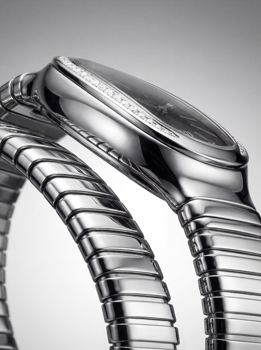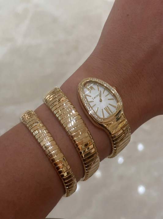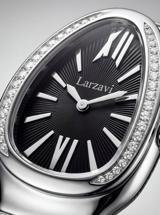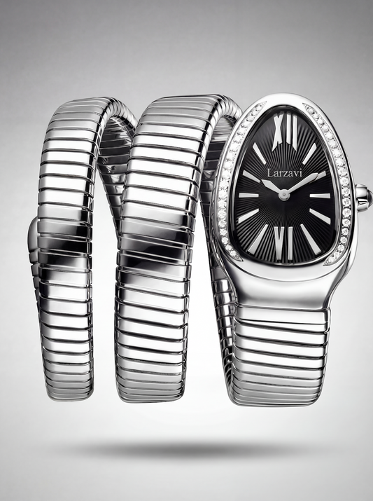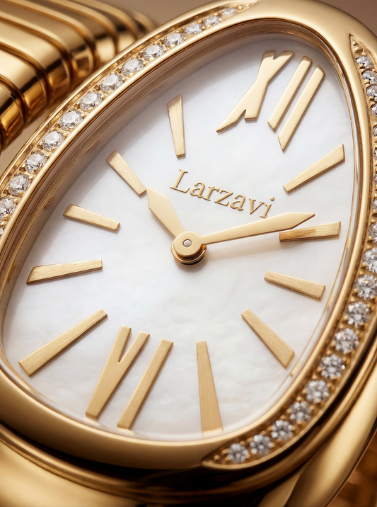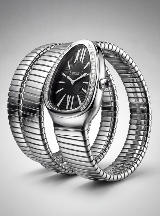 Yılan formunun büyüleyici estetiğinden ilham alan Larzavi Yılan Saat, modern kadının cesur ruhunu temsil eder. Sadece bir saat değil, bileğinizi bir sanat eseri gibi saran ikonik bir mücevherdir.